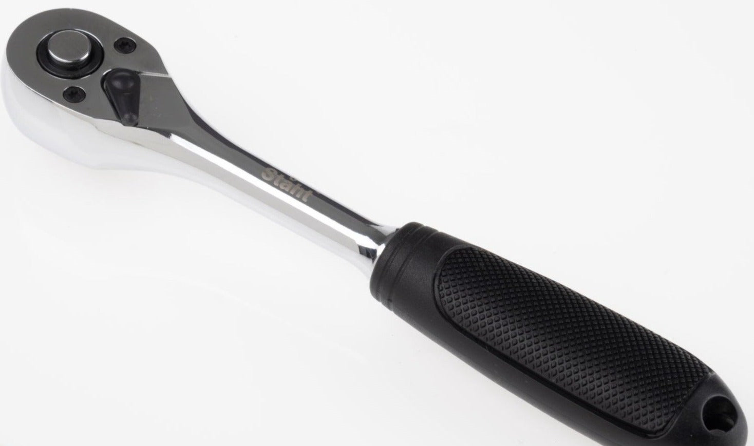 Staht socket wrench, chrome finish with black handle.